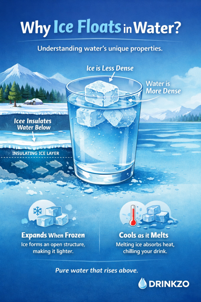 Ice floating on water also helps regulate temperature. As ice melts, it absorbs heat from the surroundings, naturally cooling the water. This is why a few ice cubes can quickly chill your drink without instantly melting away.